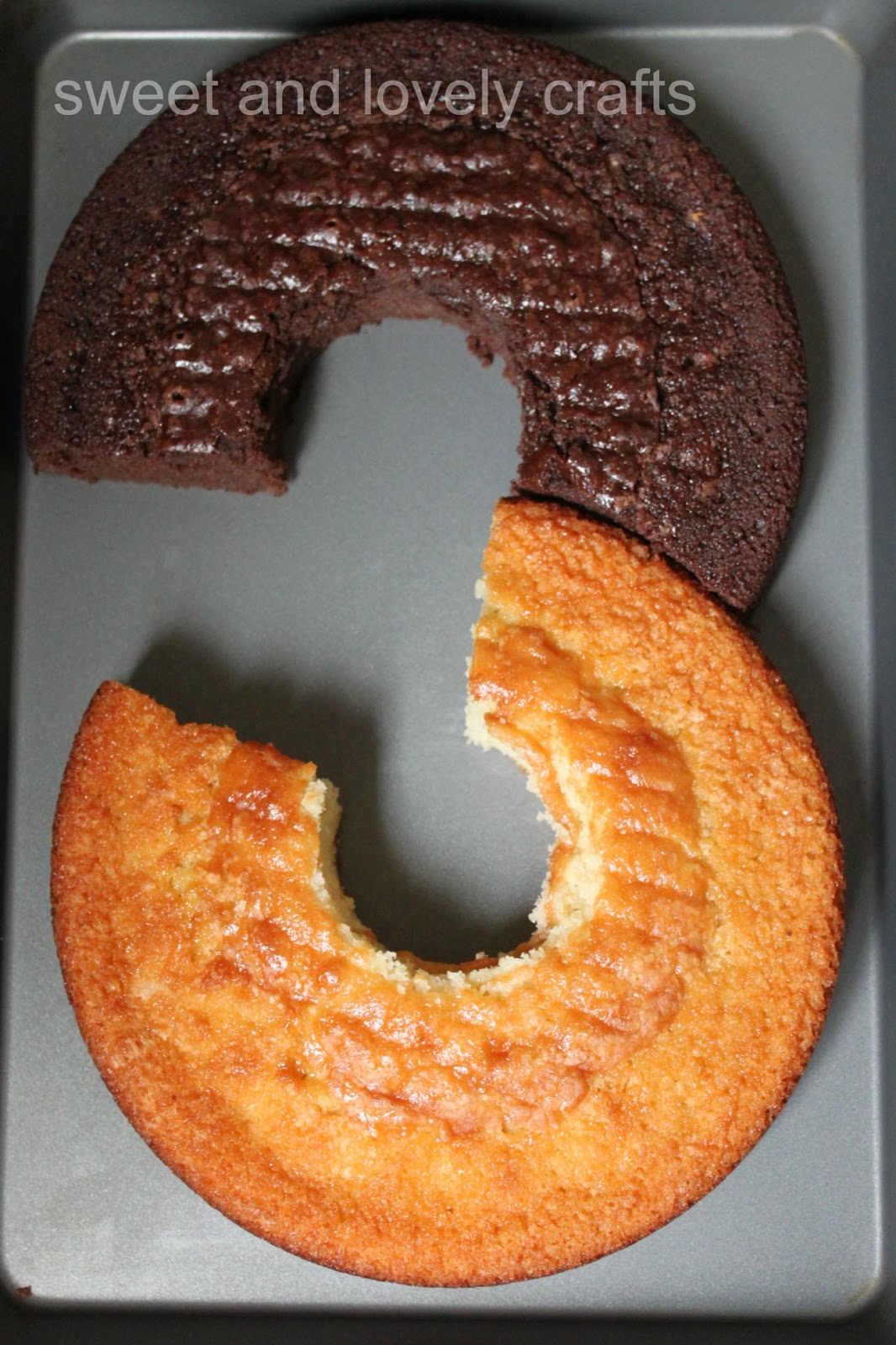 I made two cakes for this party, a chocolate and white cake. I baked them both in a round cake pan. Then I used a large circle cutter to cut a circle out of the middle of each cake. I made a template for the cake, and then cut a section out of each each. My sister used the chocolate cake leftovers to make cake coal pops.